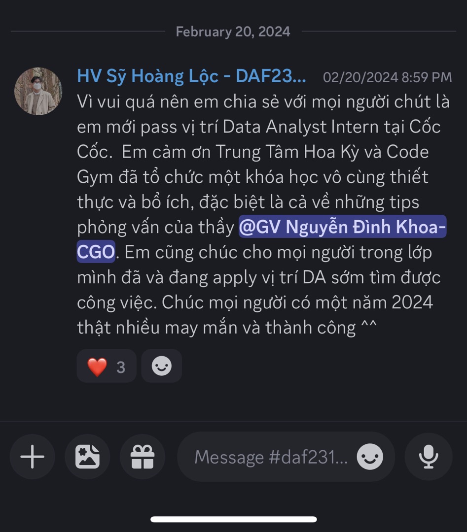 Ban đầu em cũng sợ học online không hiệu quả, nhưng ở CodeGym mọi người support rất nhiệt tình, mentor cũng nhanh chóng giải đáp thắc mắc cho tụi em. CodeGym Online đúng là nơi ước mơ bắt đầu. Cảm ơn mọi người nhiều.