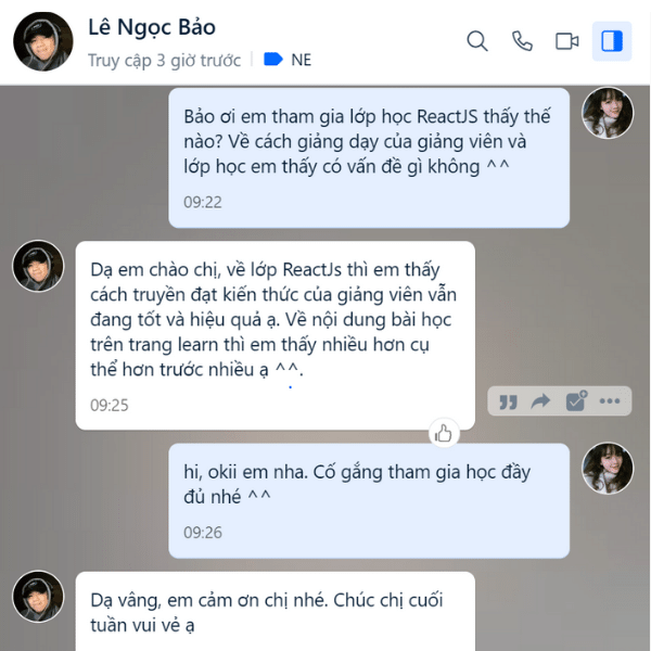 Mình học ở CodeGym Online thấy rất thích, bởi chương trình được thiết kế phù hợp cho người mới bắt đầu. Dạo này cứ mở Python đọc đọc miết mà vui á, mới học có mấy buổi cũng đến phần khó, mà thầy nhiệt tình lắm, hồi đầu học online sợ không theo kịp, mà có gì thầy cũng nhiệt tình chỉ. Cũng cảm ơn các chị giáo vụ, tư vấn tuyển sinh đã tận tâm tư vấn.
